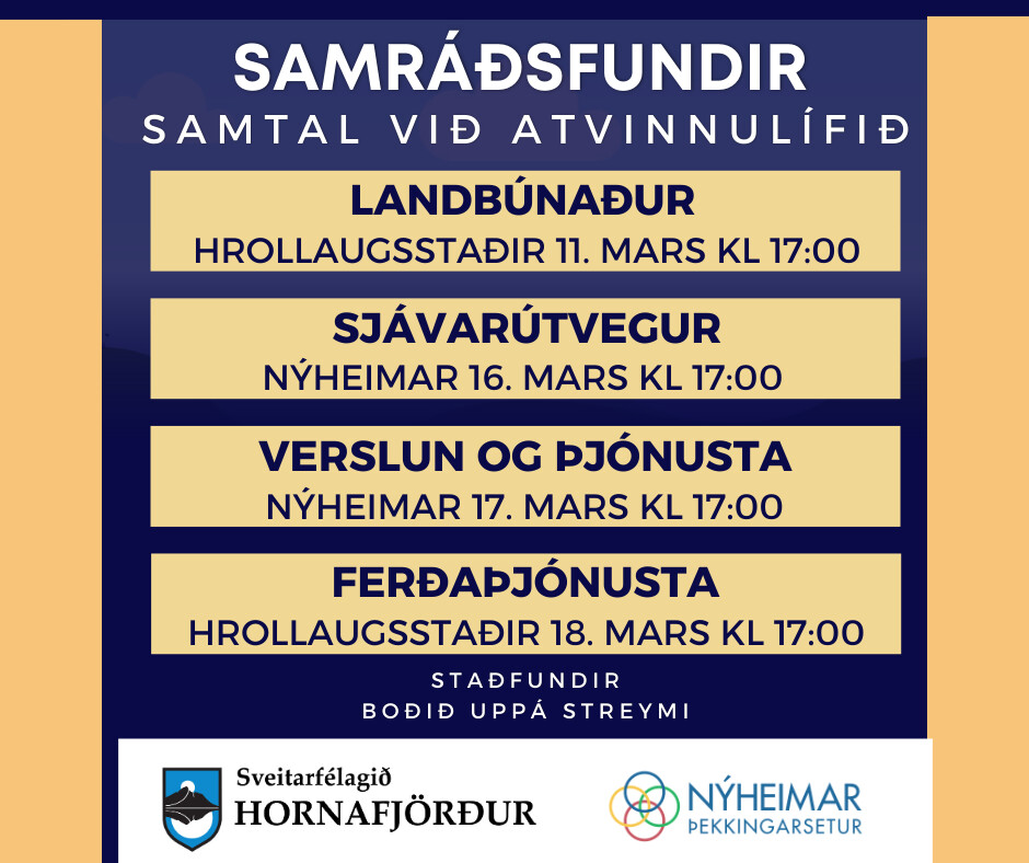 Samráðsfundir með atvinnulífinu Nejra Mesetovic gegnir stöðu Byggða- og nýsköpunarfulltrúa Sveitarfélagsins Hornafjarðar sem er hýst innan Nýheima þekkingarseturs í gegnum samstarfssamning. Byggða- og nýsköpunarfulltrúi vinnur að því að efla samstarf við atvinnulífið og styðja við nýsköpun og atvinnuþróun. Fulltrúinn er til staðar fyrir einstaklinga, frumkvöðla og fyrirtæki sem vilja ráðgjöf, tengingar eða leiðsögn við þróun hugmynda og verkefna. Veitt er aðstoð við gerð viðskiptaáætlana, leit að styrkjum og fjármögnun, auk þess sem […]