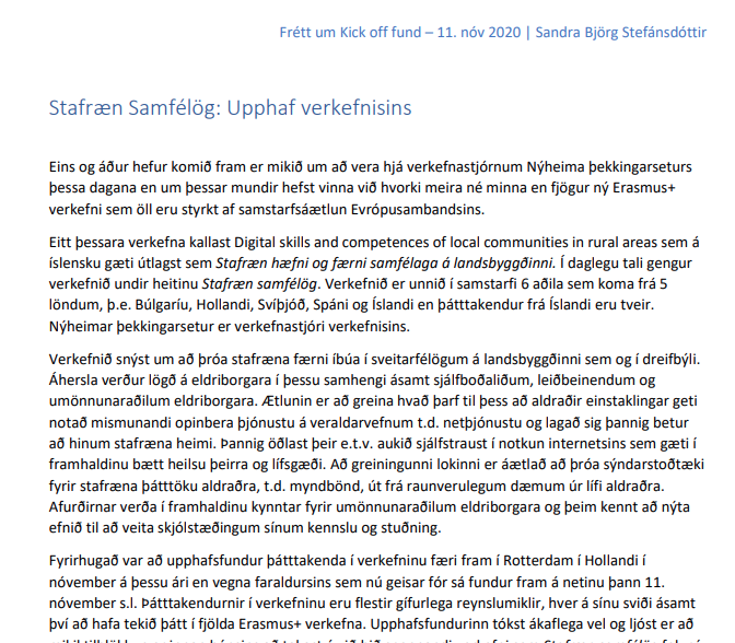 Nýheimar Þekkingarsetur tekur þátt í verkefninu Digital skills and competences of local communities in rural areas sem á íslensku gæti útlagst sem Stafræn hæfni og færni samfélaga á landsbyggðinni. Í daglegu tali gengur verkefnið undir heitinu Stafræn samfélög. Verkefnið er unnið í samstarfi sex aðila sem koma frá fimm Evrópulöndum, þ.e. Búlgaríu, Hollandi, Svíþjóð, Spáni og Íslandi en þátttakendur frá Íslandi eru tveir, Nýheimar þekkingarsetur og Þekkingarnet Þingeyinga. Nýheimar þekkingarsetur sóttu um verkefnið fyrir hönd hópsins og er verkefnastjóri þess.
