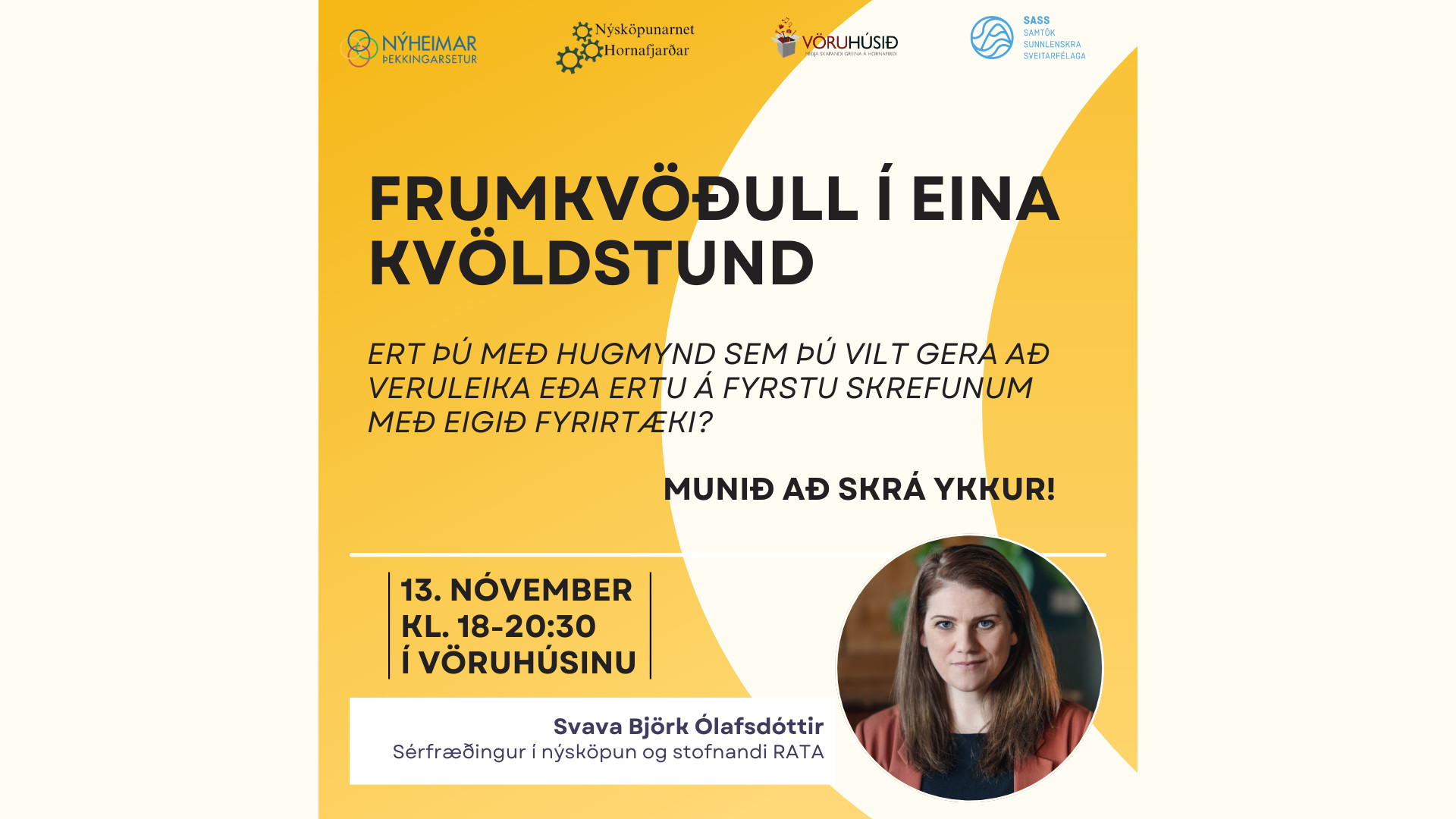 Þann 13. nóvember næstkomandi blásum við til vinnustofu fyrir alla þá sem vilja kynnast nýsköpun og frumkvöðlaferlinu, Frumkvöðull í eina kvöldstund. Þátttakendur fá tækifæri til að efla þekkingu sína, spegla eigin hugmyndir og móta áætlun um næstu skref.